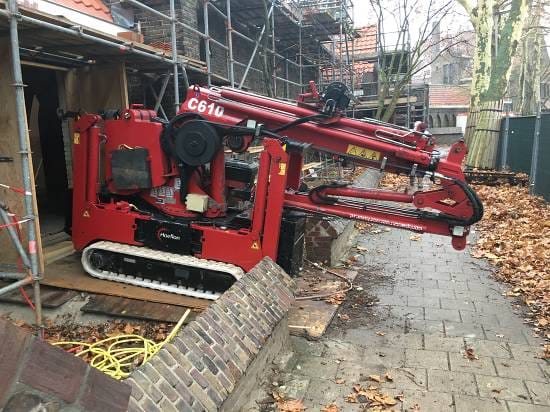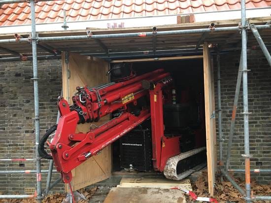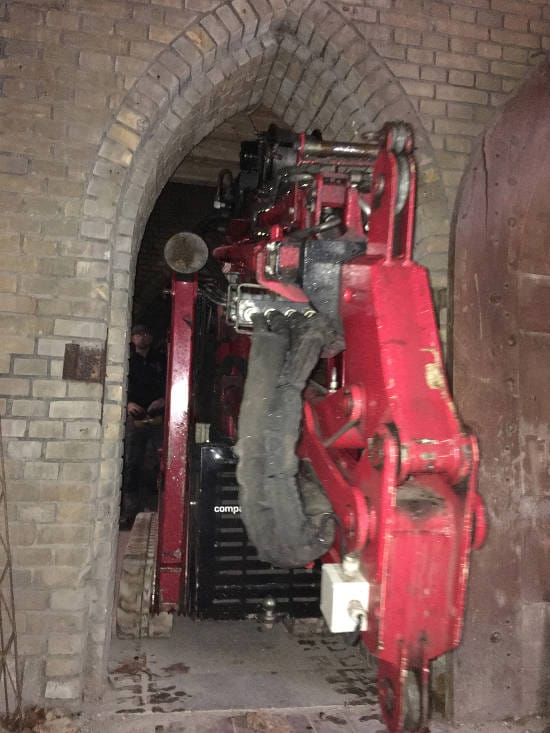 De kraan die hiervoor toegepast gaat worden is inmiddels door de smalle doorgangen in de kerk naar de juiste positie gereden.