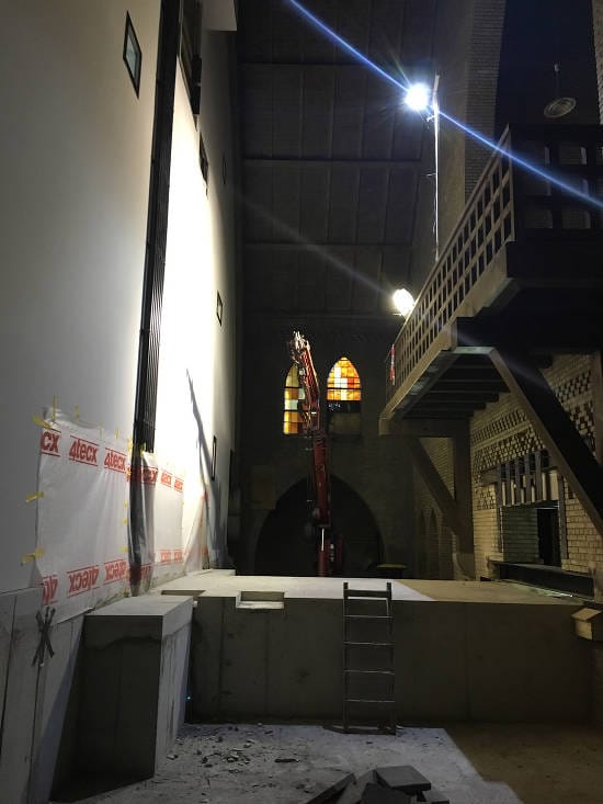 Op woensdag 5 december zijn de zichtbare voorbereidingen voor het plaatsen van de stalen hoofdtrappen gestart. Deze trap moet toegang gaan geven tot de bovenste appartementen welke gerealiseerd zijn in de kerk. Doordat de werkzaamheden inmiddels in een ver gevorderd stadium zijn, zal er geen opening in het dak gemaakt worden om de trap naar binnen te hijsen, maar zal de trap van binnenuit opgebouwd en naar boven gehesen gaan worden.